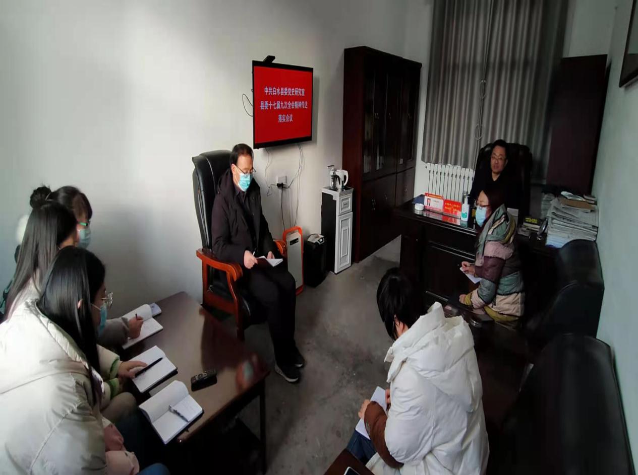 继县委十七届九次全会召开后,中共白水县委党史研究室迅速展开行动,于1月14日上午召开专题会议。会上,党史研究室主任刘鹏同志传达了全委会精神并就贯彻落实做出系列部署:一是要把会议精神的学习作为当前工作的一项重要任务来抓,把会议精神的学习做为2021年党员“三会一课”的学习内容并列入年度学习计划,近期连续组织三次专题学习活动,确保全体干部党员学深悟透会议精神;二是把会议精神贯彻到具体工作中去,同抓好年终各项工作、疫情防控、干部纪律作风等各项工作相结合,为全县十四五规划的制定贡献才智,为“六稳六保”、安全生产工作贡献力量,扎实做好中央八项规定精神的落实和年终慰问工作;三是全力抓好会议精神的贯彻落实工作,围绕县委确定的工作重点,聚力发展、聚力团结、聚力工作任务,大力抓好落实。特别是围绕建设“人文白水”,推进《西北野战军在白水》的编辑出版,为白水“三个文化”建设贡献自己的力量。